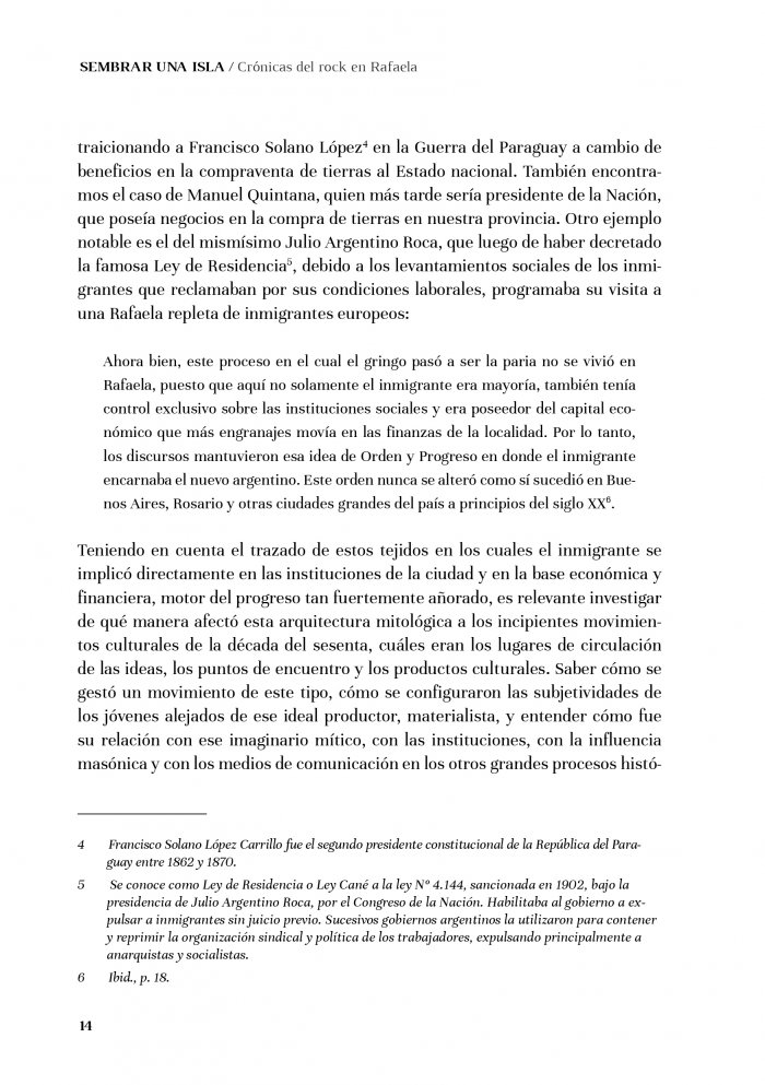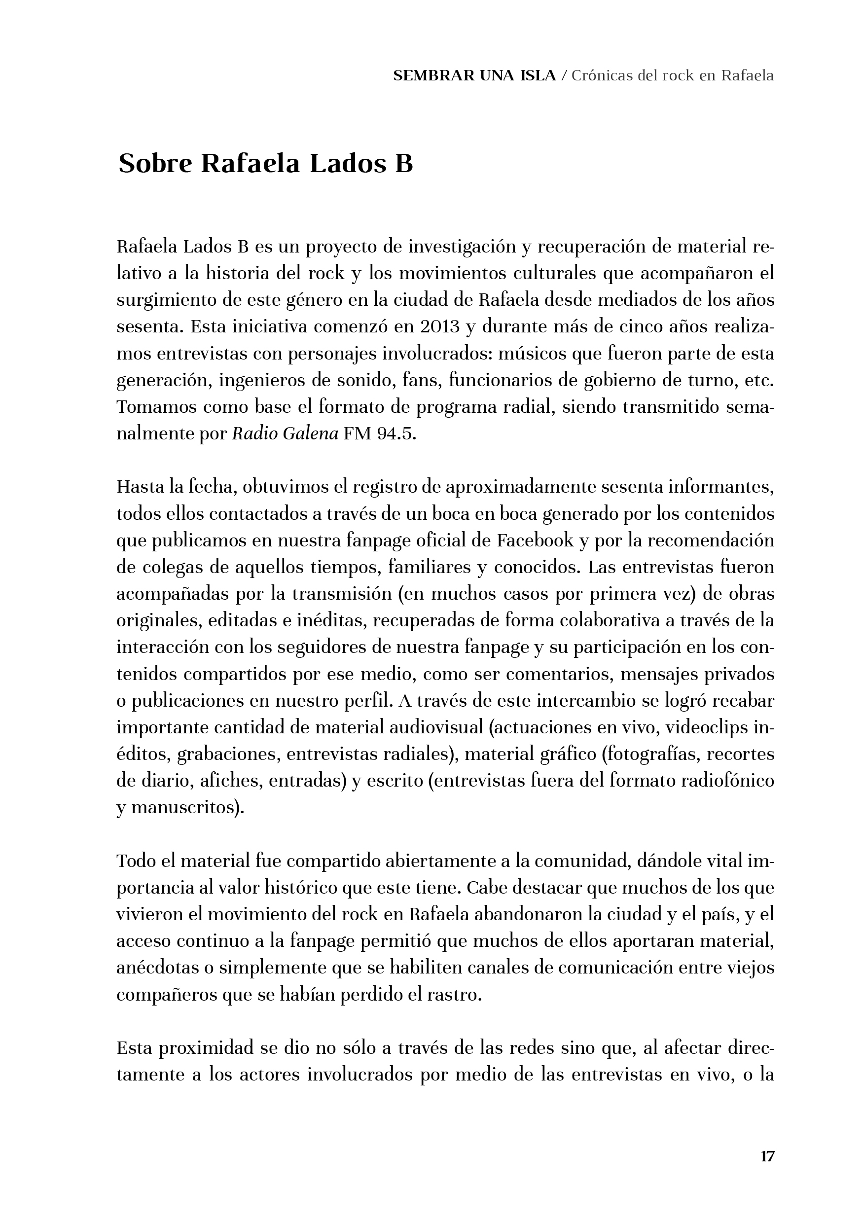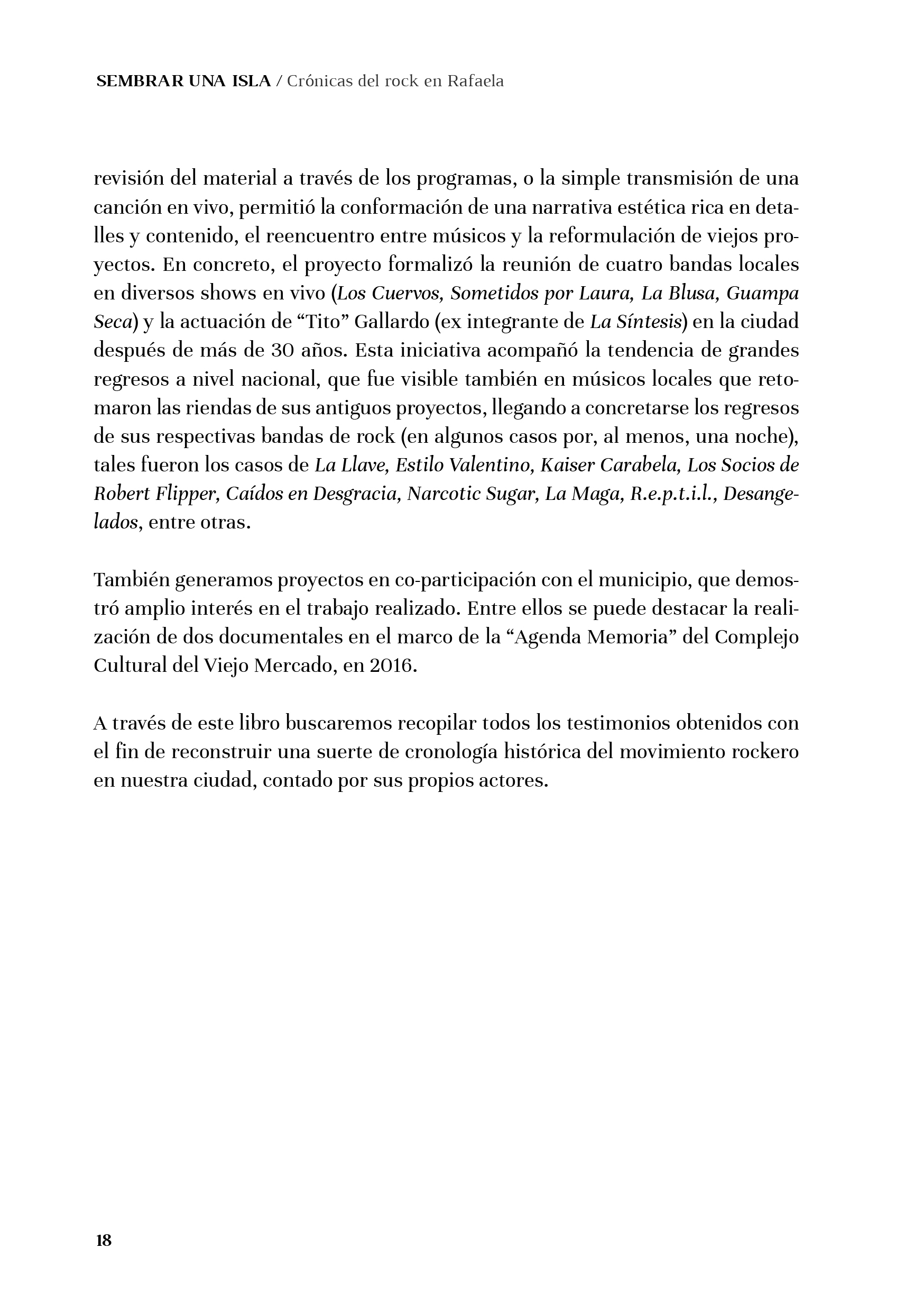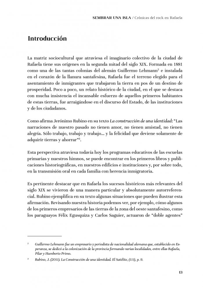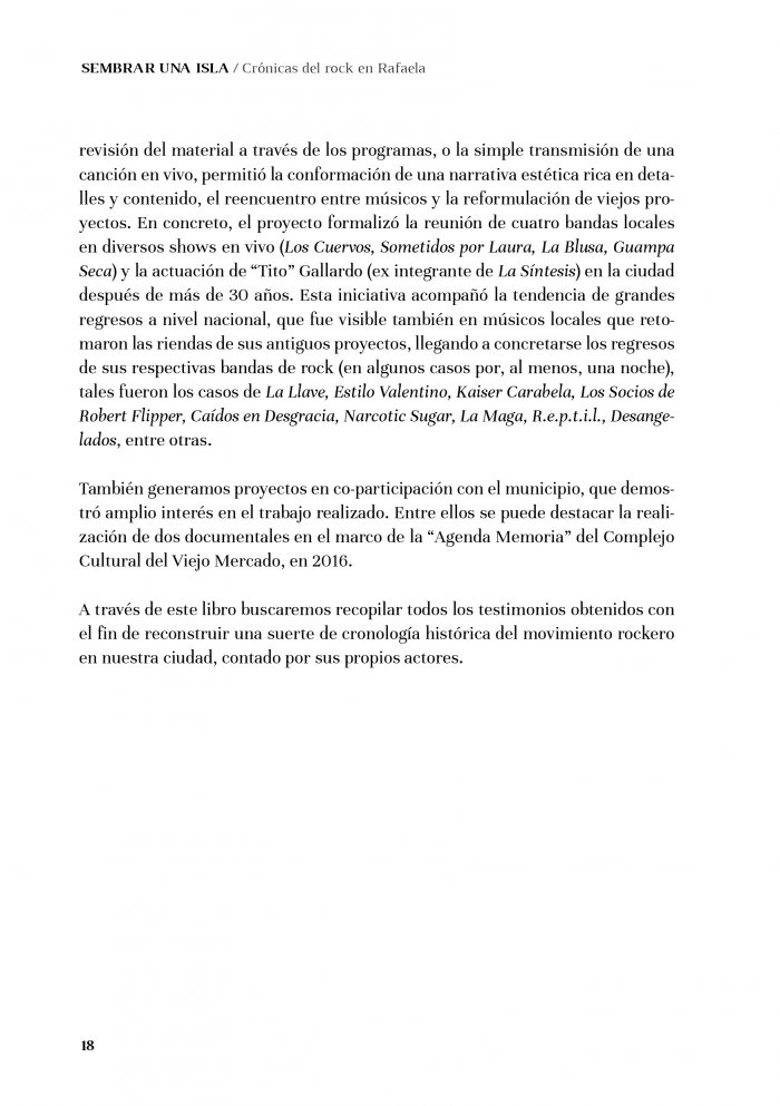 “Sembrar una isla” fue el título elegido para la obra, refiriendo a la tarea de aquellos primeros pioneros locales que tomaron las riendas de la cultura joven de los años sesenta y que apostaron al cambio, tomando al rock como una herramienta de conquista, revolución y progreso frente al conservadurismo de una ciudad chica instalada en medio de la pampa gringa: la “isla” Rafaela.