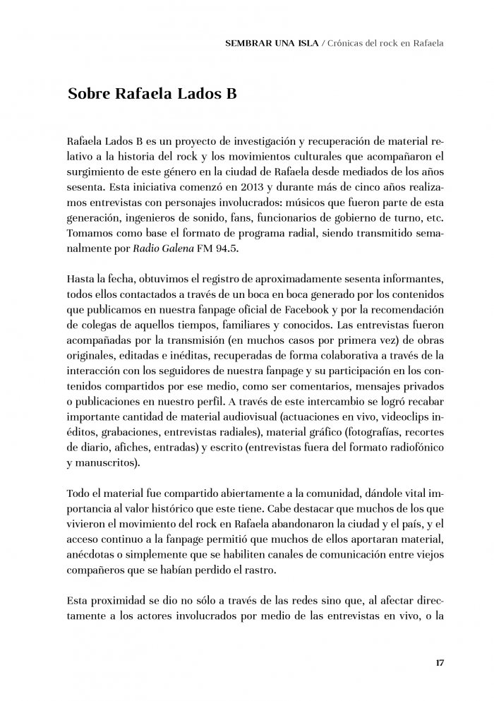 Este libro de 200 páginas reconstruye la historia del surgimiento de los movimientos juveniles y la cultura rock en la ciudad de Rafaela entre 1965 y 1989 y presenta una narración cronológica articulada con datos de relevancia sobre el contexto histórico de la época y de la ciudad de Rafaela.